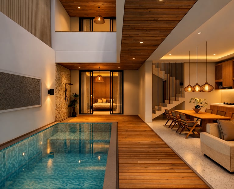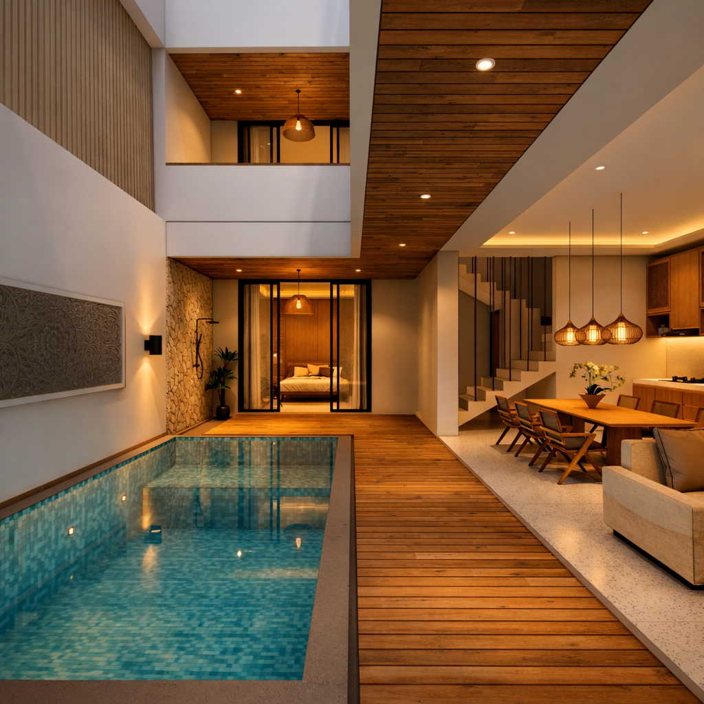 Unit Beryl menawarkan desain minimalis elegan dengan akses langsung ke taman tropis yang rimbun, menciptakan suasana tenang dan privat untuk penghuni.